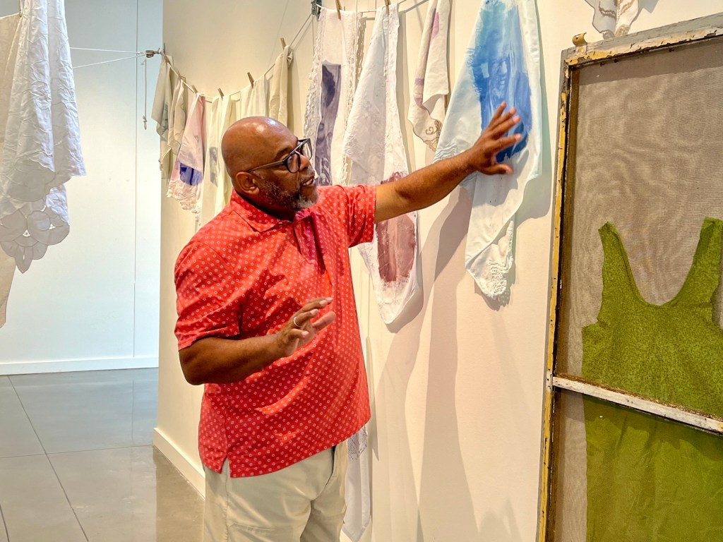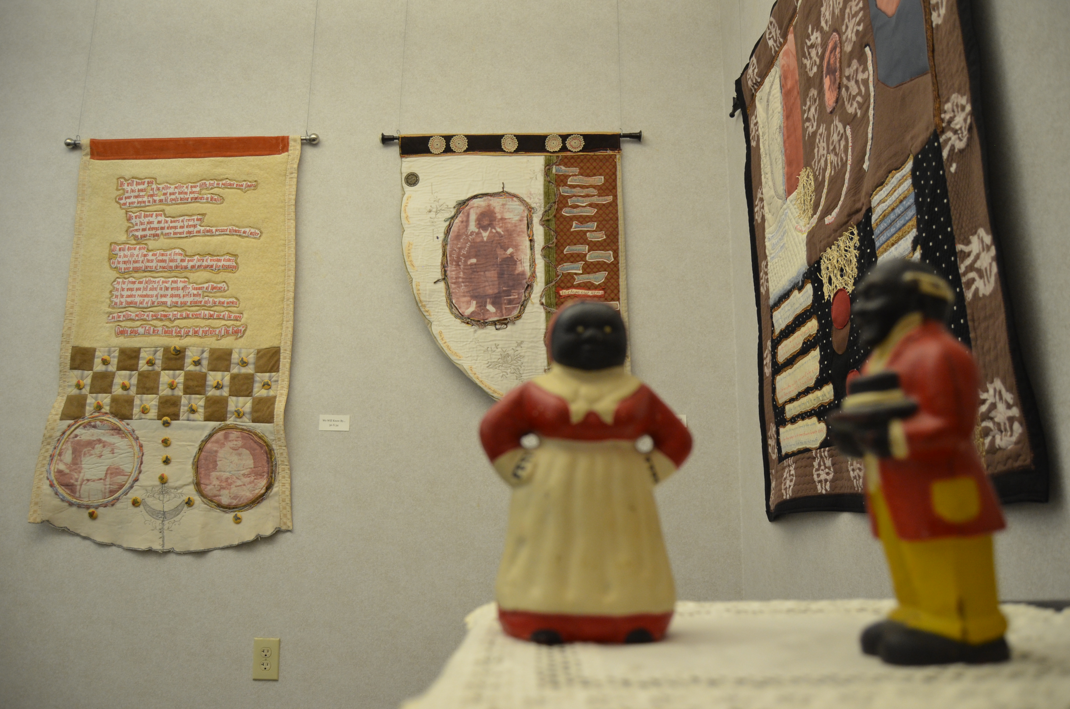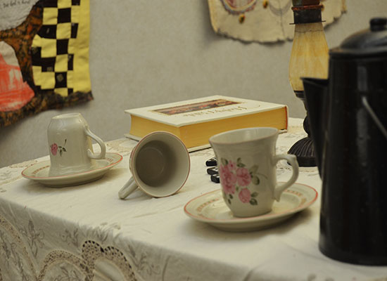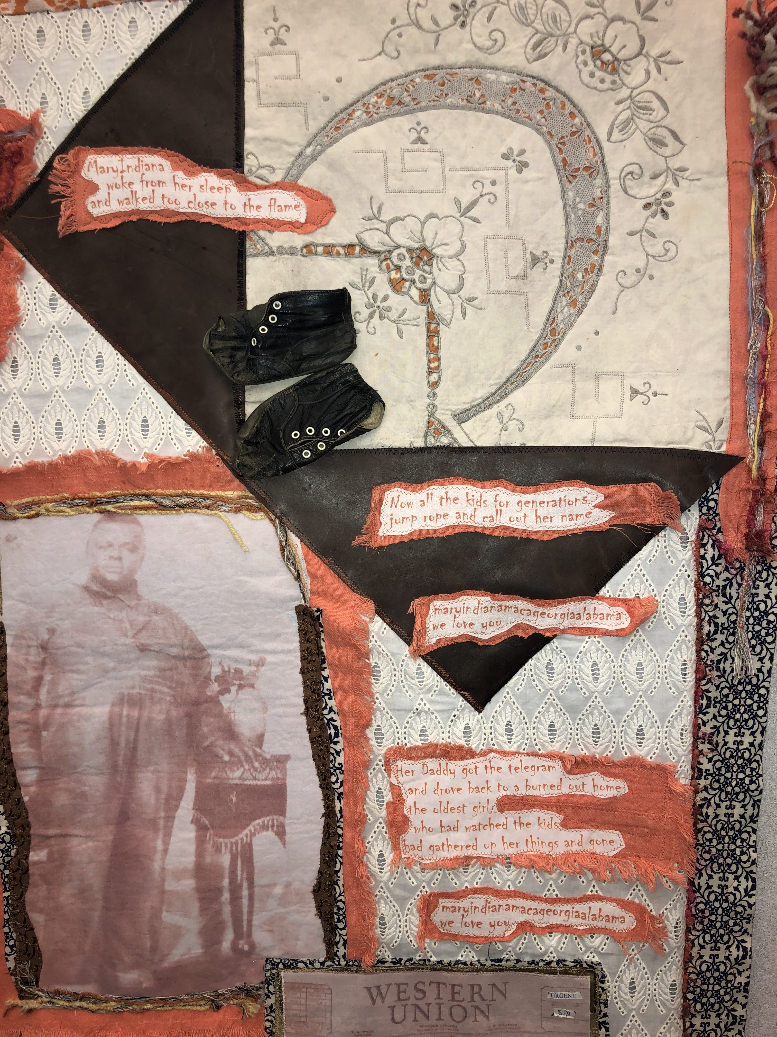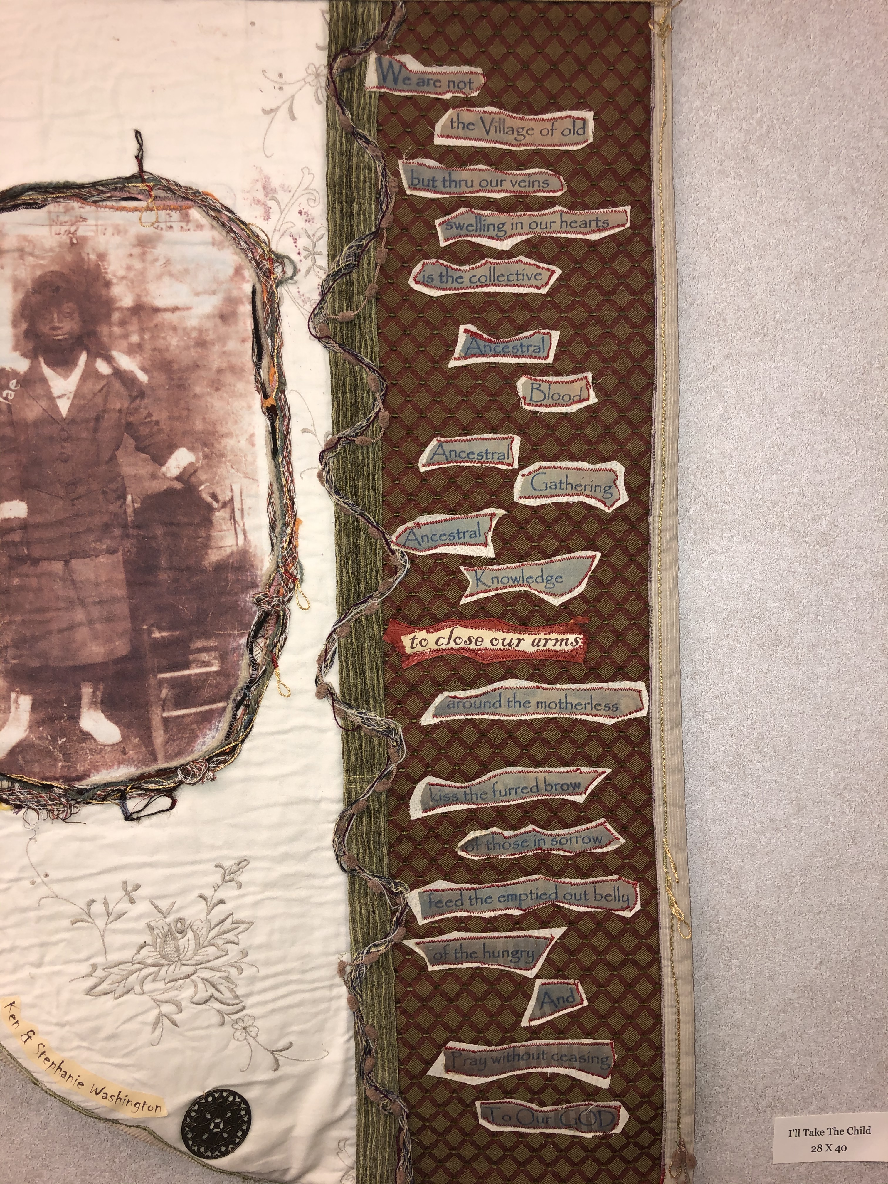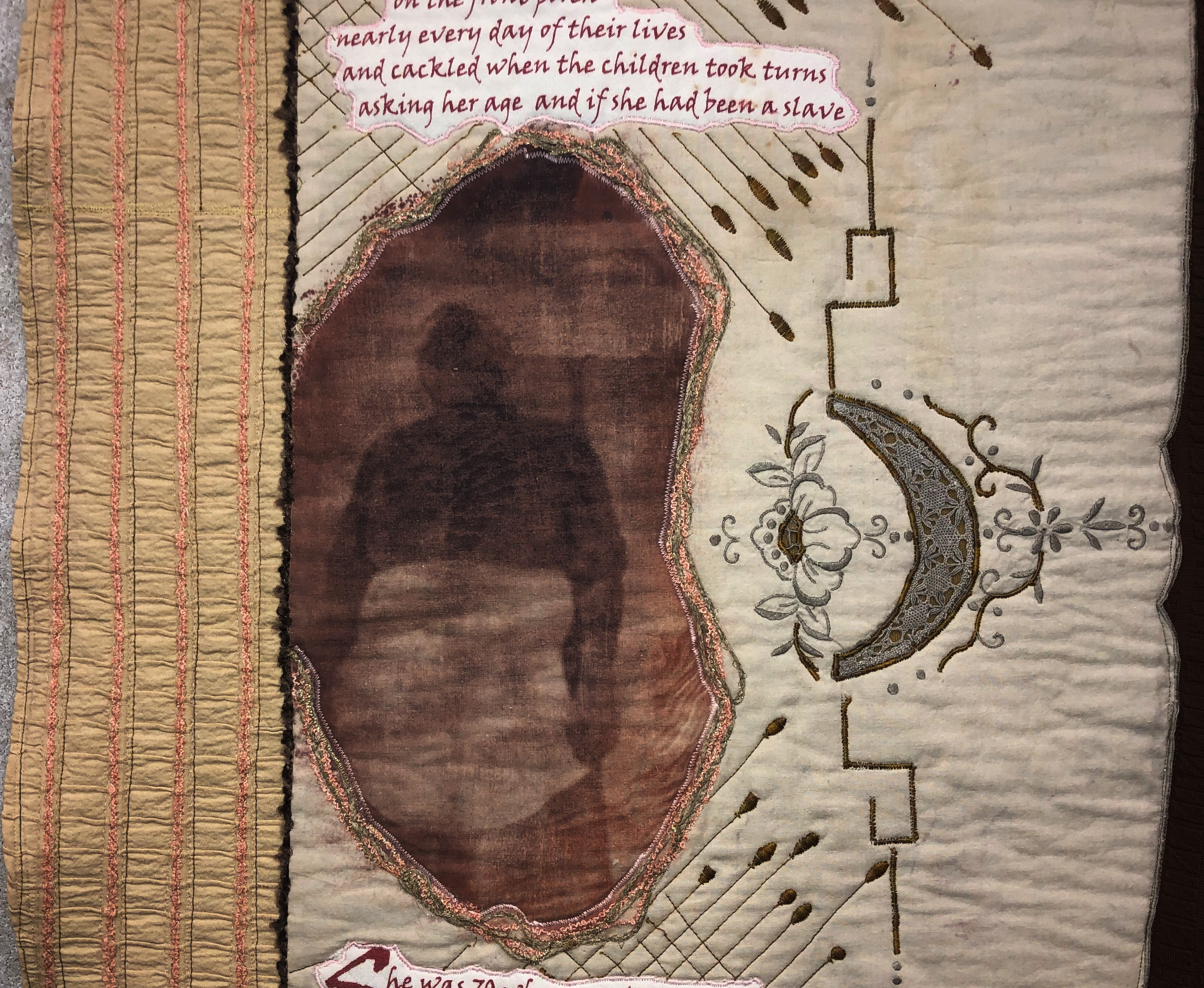 An exhibition of 13 Quilted Pieces made from a single heirloom tablecloth with each section where a family member sat is made into a quilt that tells their story.