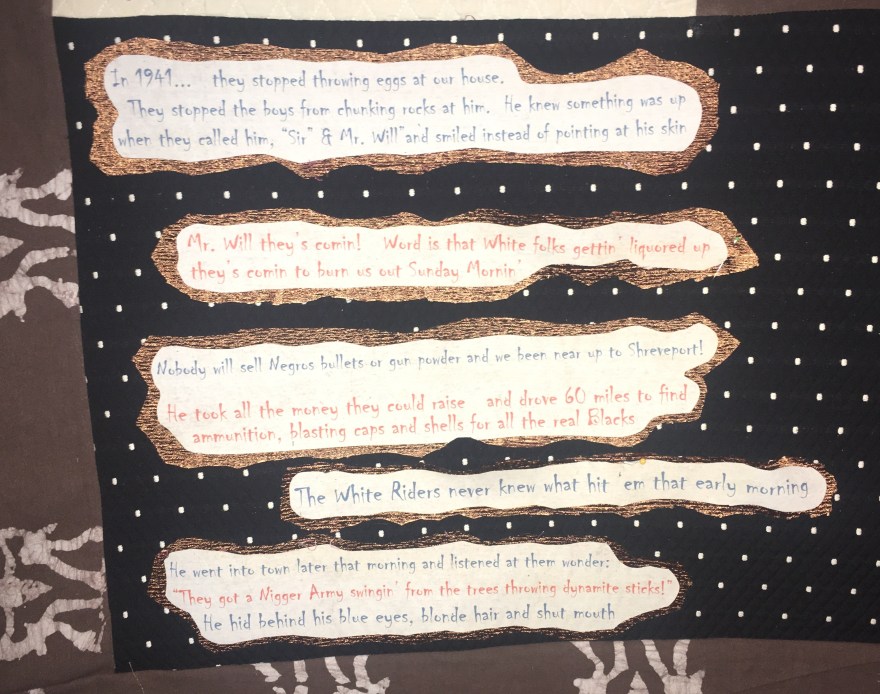 I hope that your imagination and remembrances of home are triggered by this series. The full exhibition includes 8 other fabric works of story narratives that include political, racial, injustice and other family tales and truths.