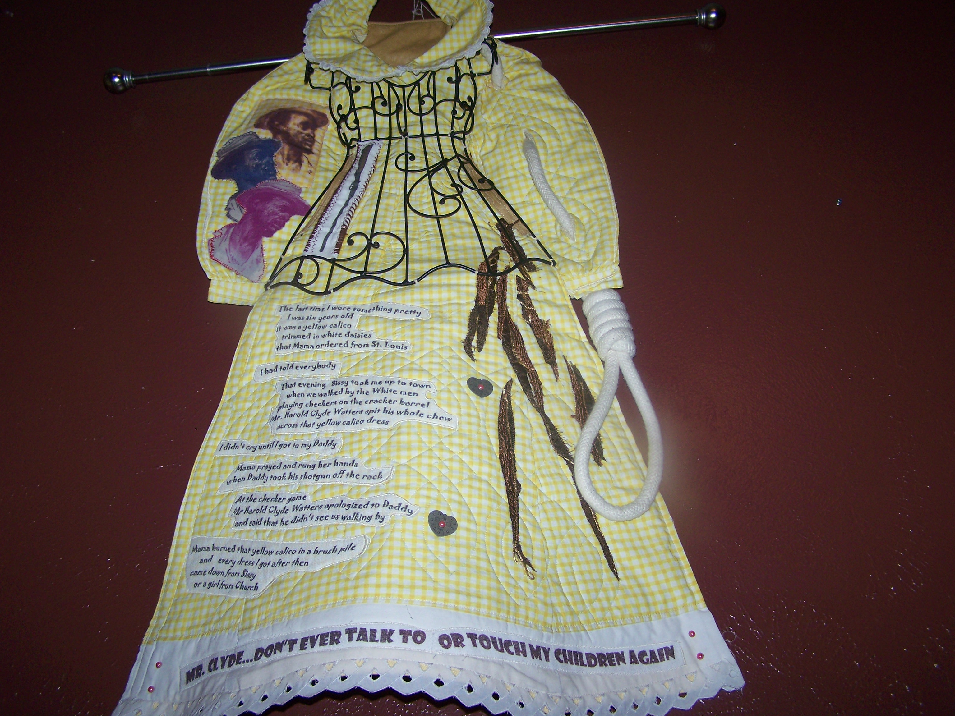 “He Spit His Whole Chew Across My New Dress” is a narrative fabric art piece designed on a girl’s dress and using an iron dress frame to represent both family and racial restraint. The piece is from a family story shared about the 1942 events in a small Texas town when a 8 year old Black girl wore a new dress into town on a Sunday afternoon and a White citizen, playing checkers with other men on the porch of the General Store, waited for her to pass and spewed his mouthful of tobacco across her dress.