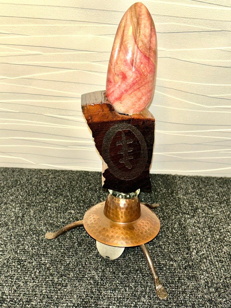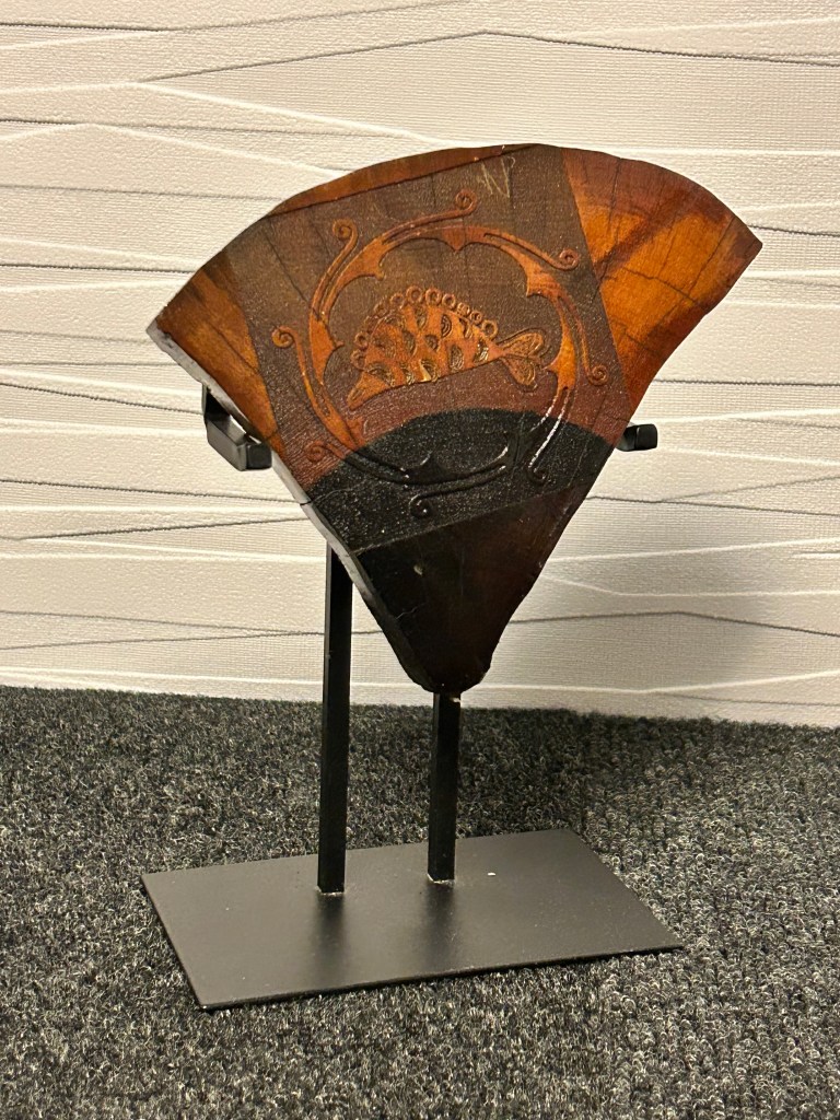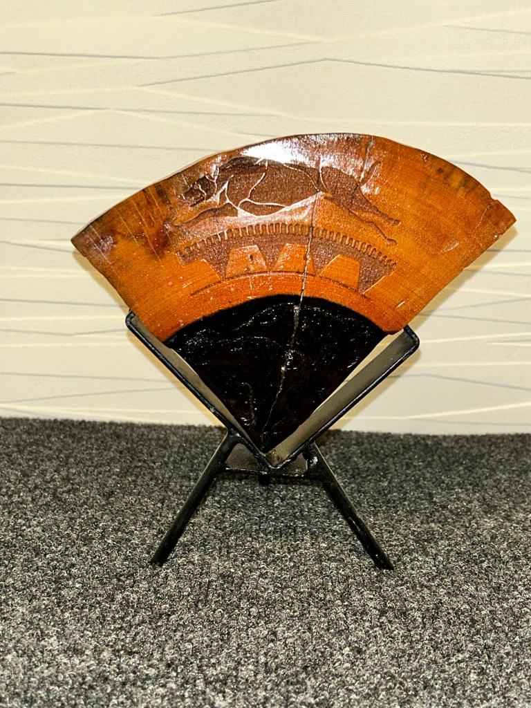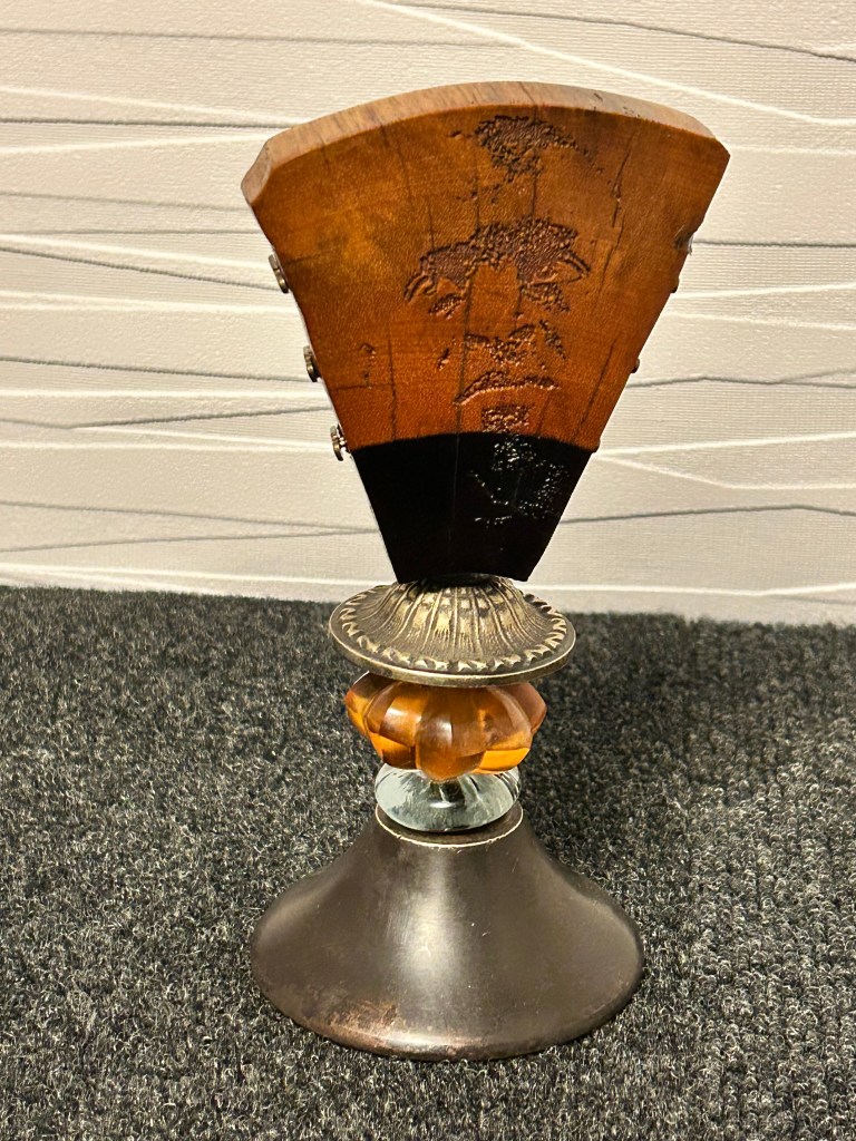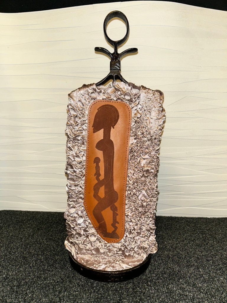 A round chin mask is from the Fang Peoples. A wood that is colored with kaolin (chiny clay) Ngil mask from Gabon or Cameroon. Worn with full costume in a night masquerade to settle disputes and quell misbehavior, this calm visage was terrifying to wrong-doers. I have created the mask as a hanging display on a cracked wedge of Texas Ebony swinging against a metal bar above two crossing metal branches with red tips in a bowl. The swing is attached using a leather strap so that it sweeps freely in the winds and can be seen by all “wrong-evil doers”.