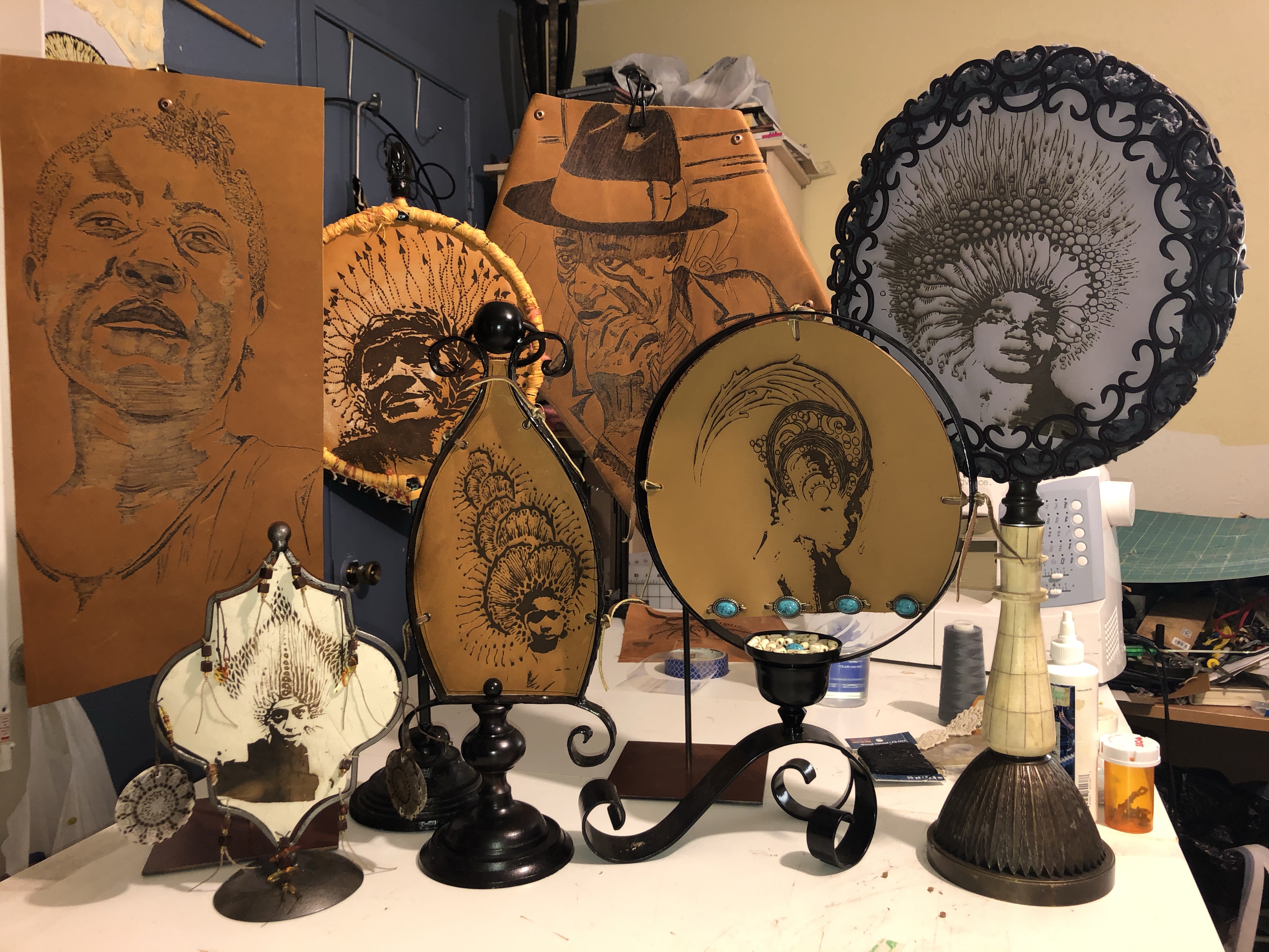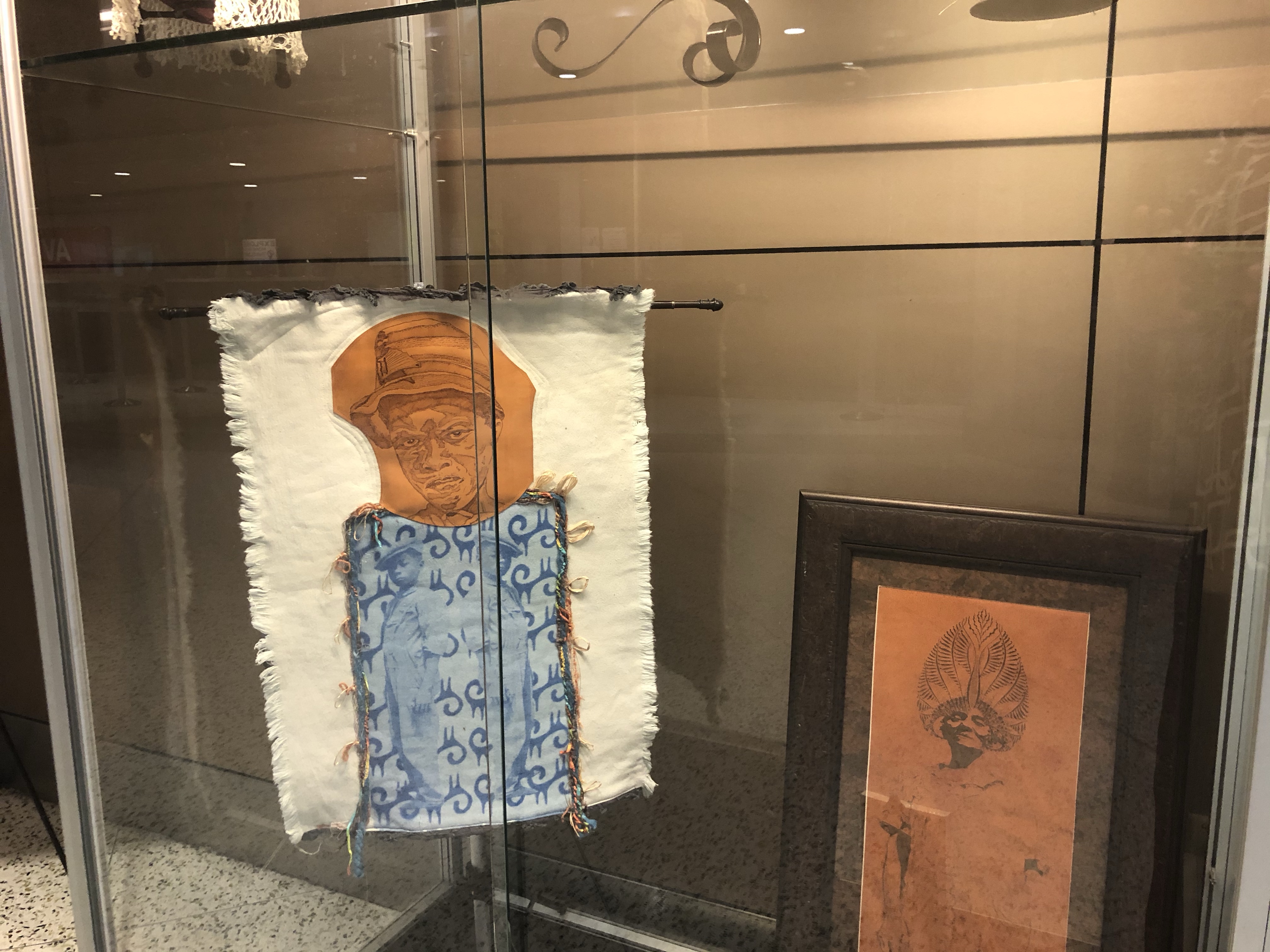 Love Field Airport has featured me for the second 2020 exhibition: Jas MARDIS:HOME for the month of June. The highlight of this exhibition is a fabric and leather piece from the series, Mothers & Sons: “Sons of Her Thunder” subtitle: “Not Another Boy Harmed!”. Select pieces from my “Just A Crown” series on pedestals and two leather burned portraits on new stands complete the display.